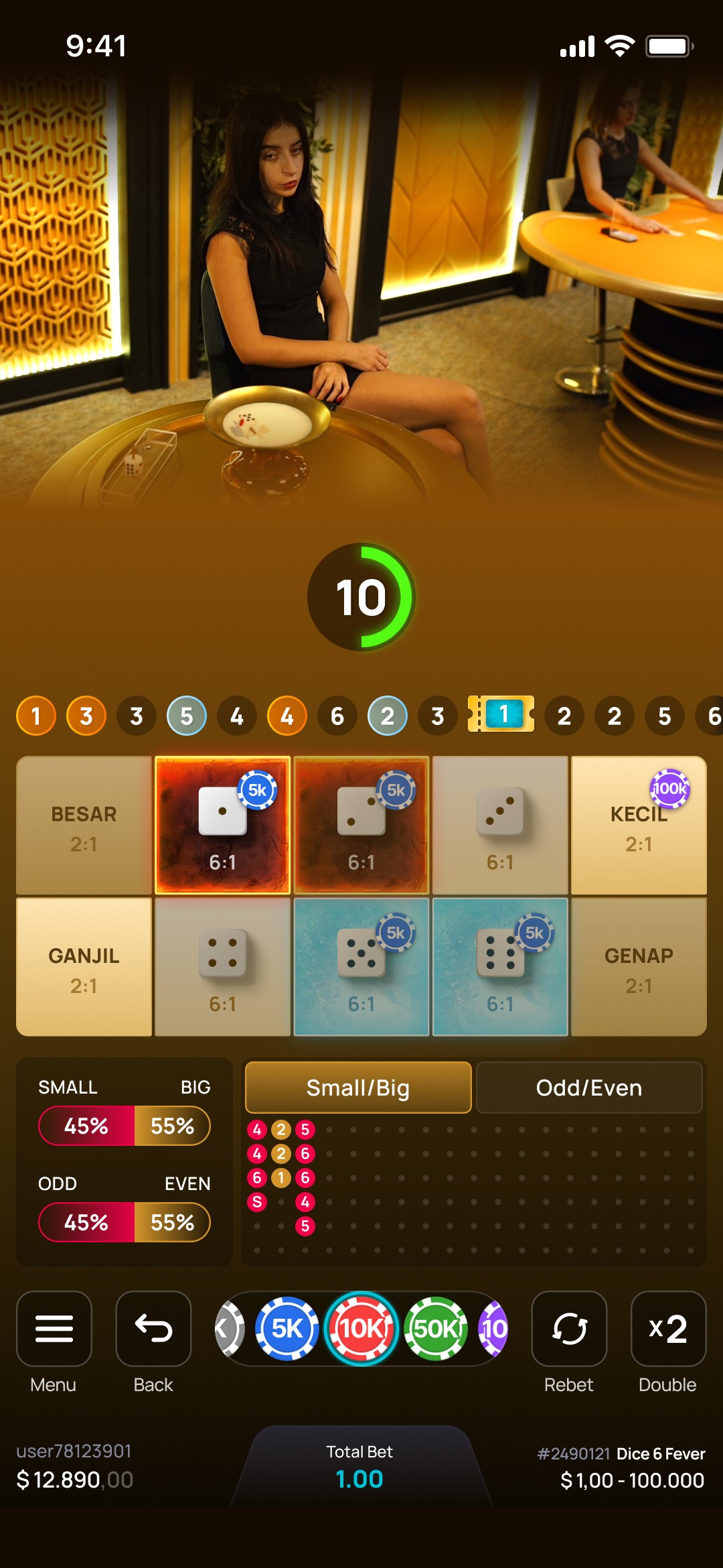 Dice 6 Fever brings the latest HOT & COLD bonus! Grab your chance to win up to 18x JACKPOT! Simply guess the numbers from 1 to 6, as well as Big/Small and Odd/Even for bigger rewards!