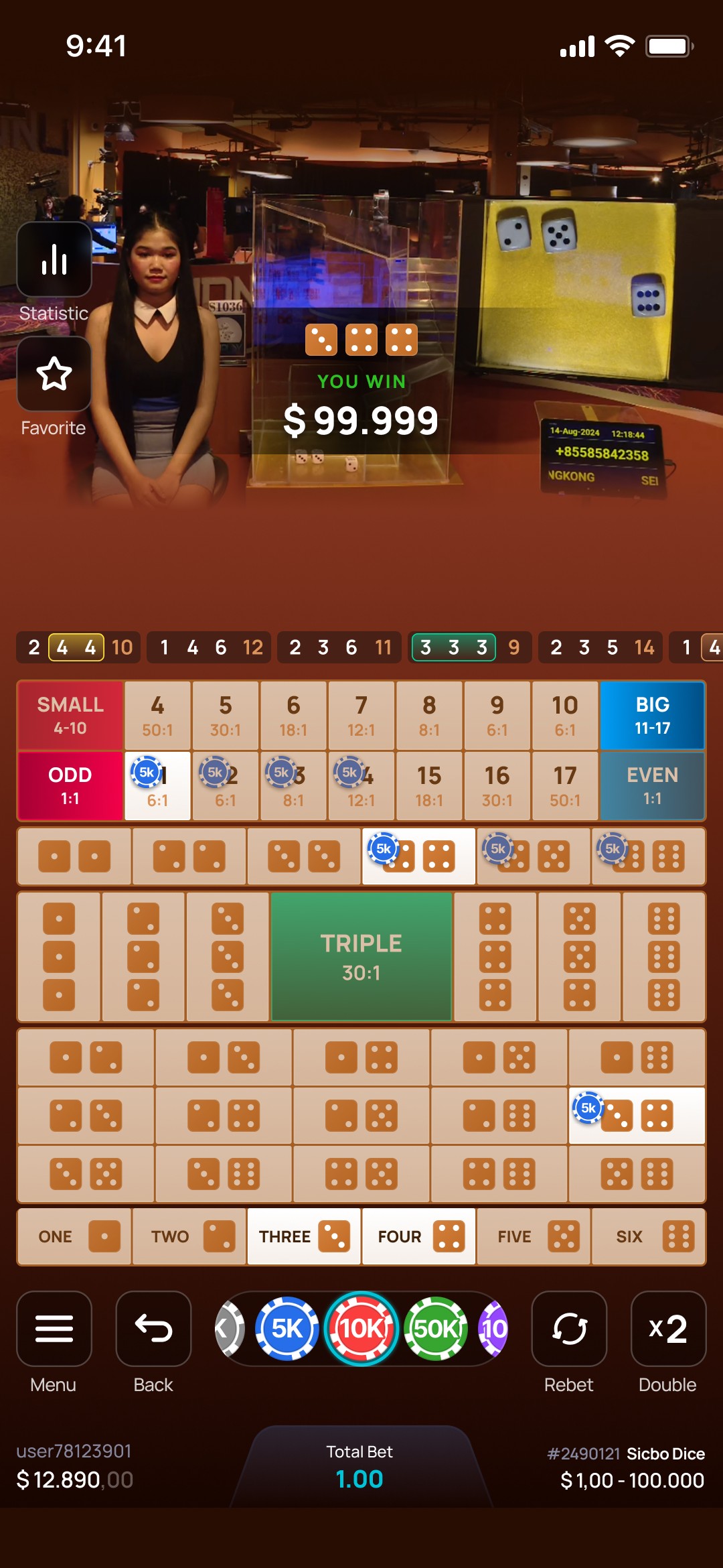 Guess the outcome of 3 dice rolled into the box. Bet on various options like Single Die, Dice Combinations, Double Dice, Triple Dice, the Total of 3 Dice, and even Odd/Even or High/Low.